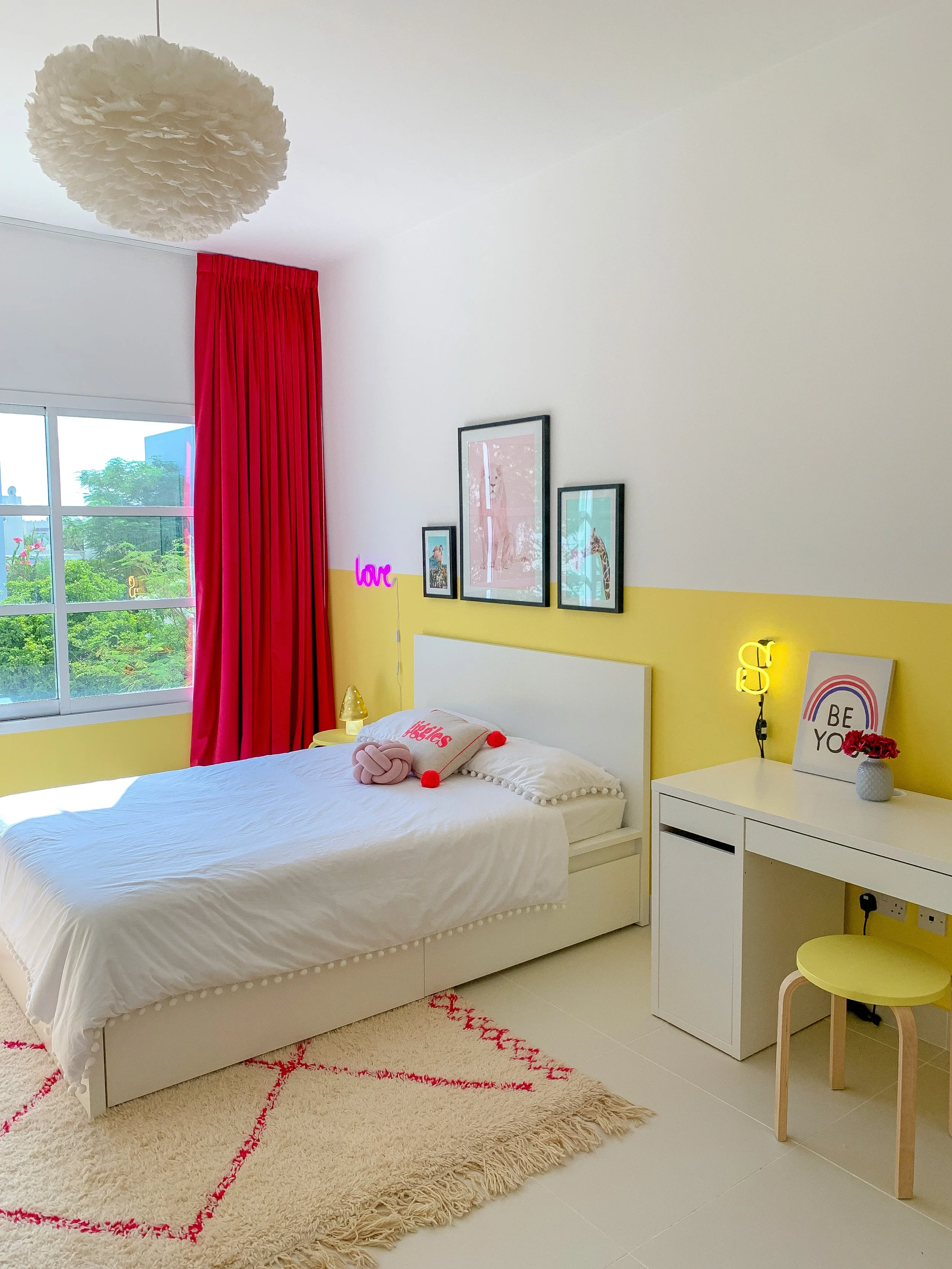Welcome to our very own Stella’s bedroom. We designed it together from concepts to execution. The inspiration came from a vibrant room by Oh Joy we found on Pinterest while looking for ideas and it all snowballed from there. It’s the first time Stella has been old enough to help me with ideas, decisions, and even styling. We had so much fun and it was one of the highlights of lockdown. This room was decorated on a budget - the majority of the accessories, art prints, and soft furnishings were reused from her old bedroom, and most of the new furniture is from IKEA so we had to be creative to jazz it all up. So the piece de resistance is this simple yet ridiculously fun indoor swing. Stella absolutely loves it and I can’t believe such a simple idea could be so effective. Hours of relaxing on her swing rethinking the world. And not a bit of plastic involved! The paint color is called Good Morning Sunshine by Benjamin Moore. Apt or what?!